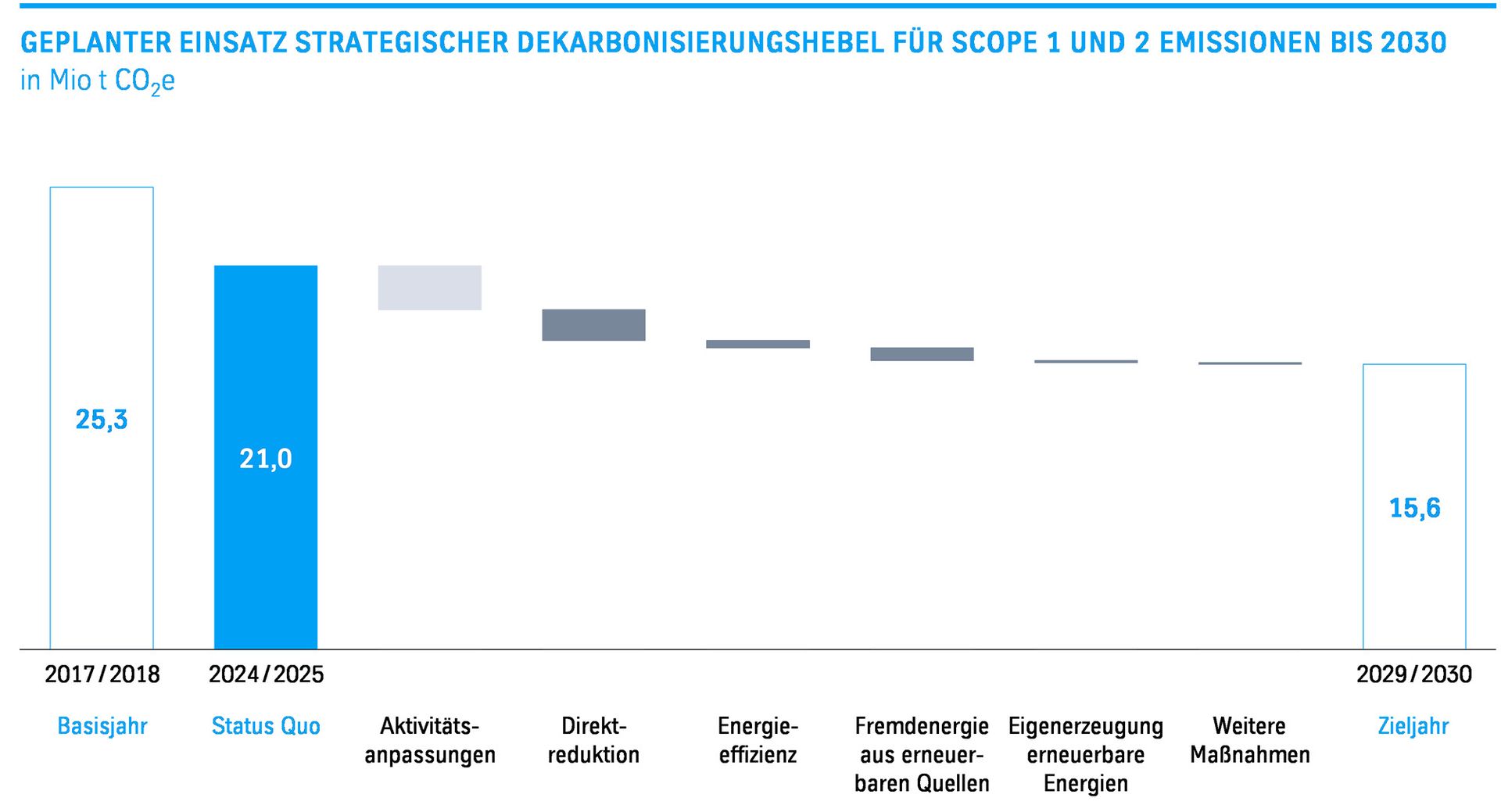 Der Haupthebel zur THG-Emissionsreduktion im eigenen Geschäftsbereich ist die Transformation der Stahlproduktion, insbesondere durch den Bau und Betrieb einer vollständig wasserstofffähigen DR-Anlage. Zudem zählen Maßnahmen zur Steigerung der Energie- und Prozesseffizienz, zur Umstellung des Fremdenergiebezugs auf erneuerbare Quellen sowie zur Eigenerzeugung erneuerbarer Energie zu den zentralen Dekarbonisierungshebeln für den eigenen Geschäftsbereich. Anpassungen des Produktionsvolumens – insbesondere im Stahlbereich – wirken sich zudem auf die direkten THG-Emissionen des Konzerns aus, stellen jedoch keinen aktiven Dekarbonisierungshebel dar.
