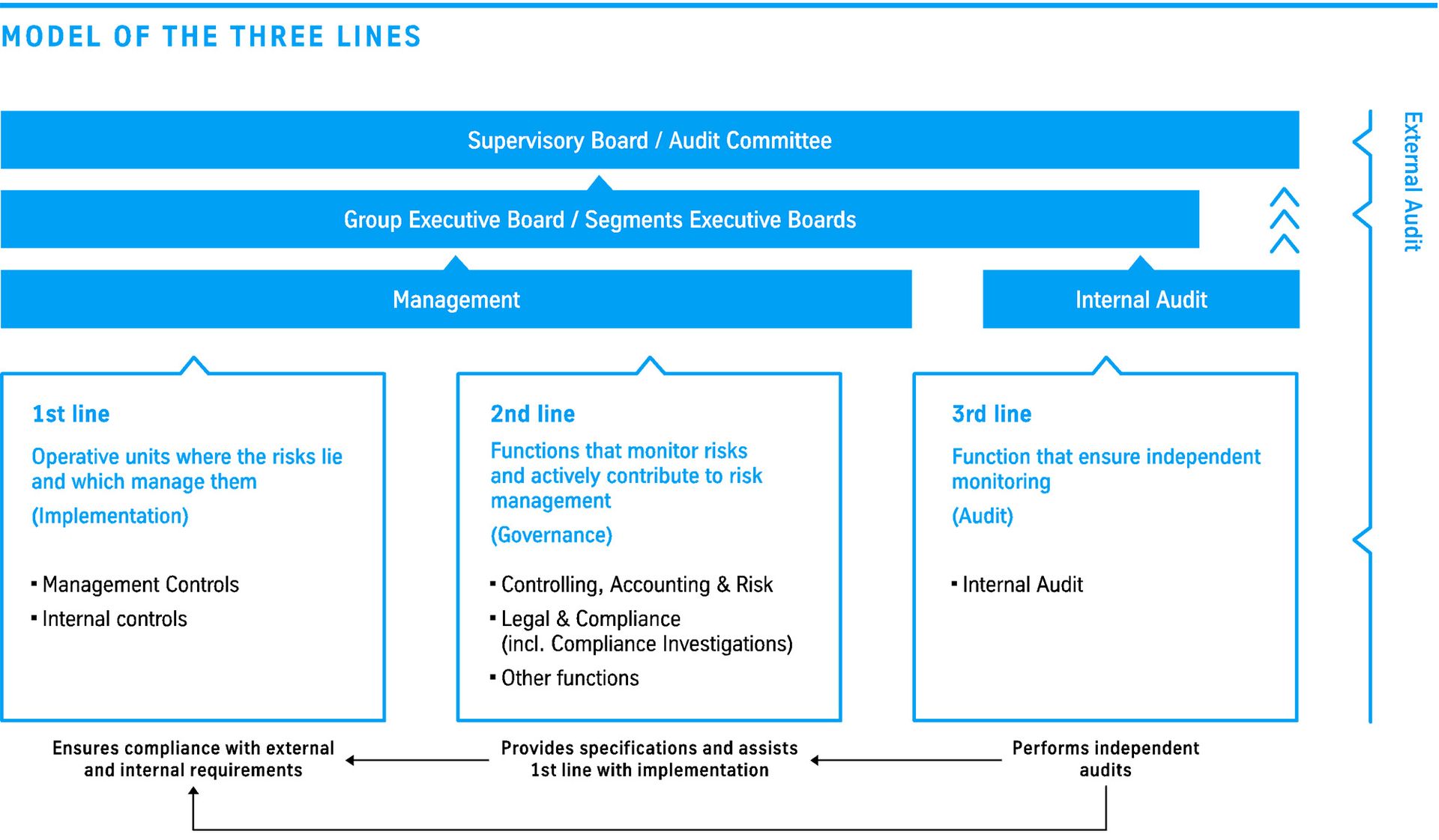 In the area of accounting, the three lines model is supplemented by the work of the external financial statement auditors.