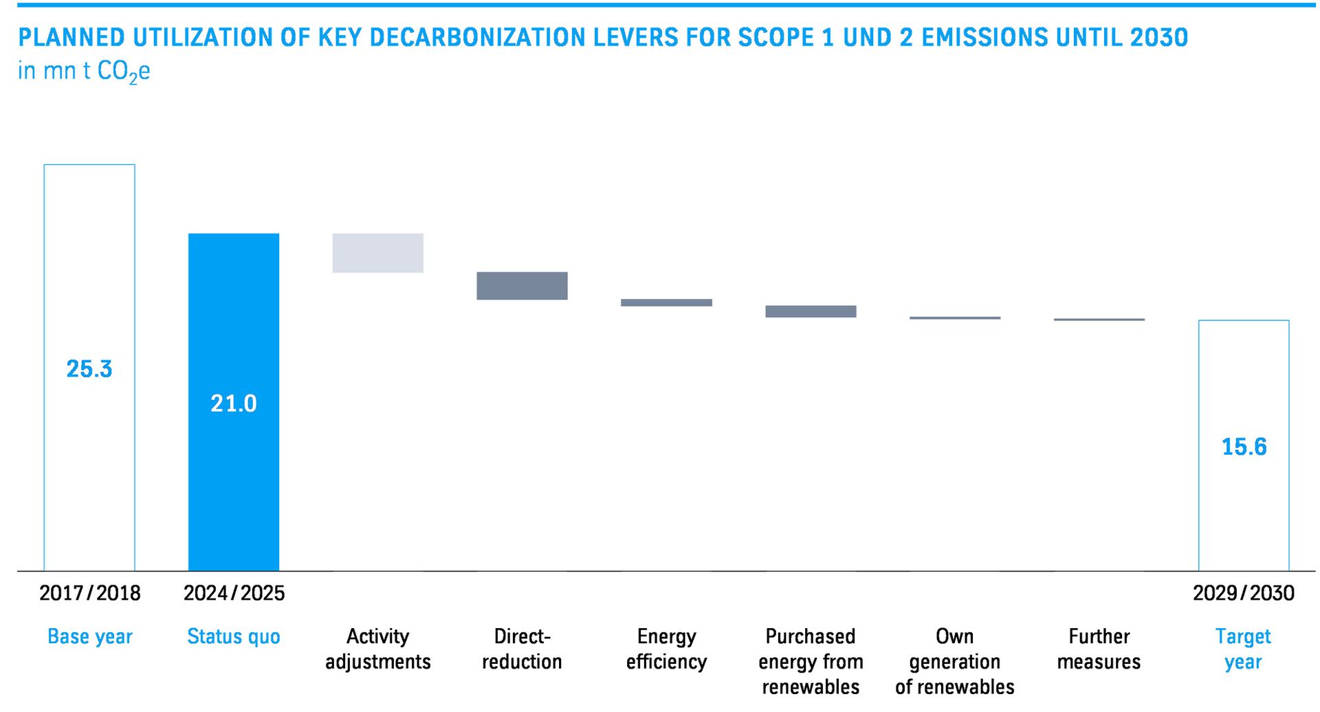 The main lever for reducing GHG emissions in the company’s own operations is the transformation of steel production, especially by constructing and operating a fully hydrogen-capable DR plant. Other key decarbonization levers for the company’s own operations include actions to increase energy and process efficiency, the switch of third-party energy supply to renewable sources and the company’s own generation of renewable energy. The adaptation of production volumes – especially for steel – also has an impact on the group’s direct GHG emissions, but is not an active decarbonization lever.